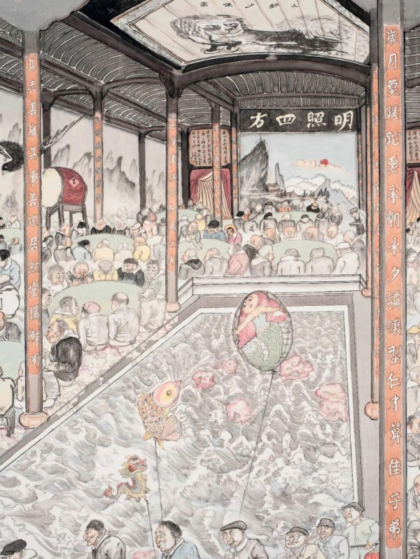 在表现手法上,除了立体结构,就绘画本身也有明显的不同:他从乡村壁画、工艺绘画中吸取了民间无名画家的散漫、随意和概括,这使作品与”渼陂“更整体。在雷子人的绘画中,他通过道具、仪式和生活场景的概念营造,强调语言和符号的相对性和多义性,以此来说明通过“渼陂“象征的现实世界并非是单一、稳定的,而是由不同的解释和表达构成的。