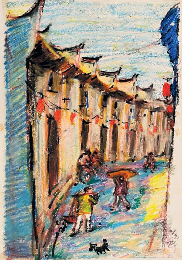 写生大致有油彩与水墨两类,油彩主要是油画棒,水墨当然是毛笔、宣纸,看日期,很多时候是同一天交叉进行,但在表现上却有耐人寻味的区别:油彩的街景、风景往往通过透视呈现一种动态的不安,也许油画棒快速的笔触影响了表现性,但无论是色彩、还是建筑、街景中的人物——甚至小动物,都通过运动呈现出某种躁动和不安;相反,水墨写生,同样的街景,却显得诗意和平静,甚至连出工这样的题材,都显得抒情。两种技巧,分别看到了作者淡淡忧伤的、万花筒般的交织心情。