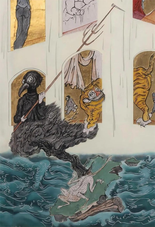 不久前,我和子人谈过造型的美丑问题,也谈过有关优雅、暴力和戏谑的问题。我知道,他的作品是最好的答案。他试图挖掘传统文化中的各种题材,例如神话、宗教、民俗之类,他将现实撕碎,糅杂进想象、梦境、观念等等主观的意向。他的画面内容有很多是迭代的、远离现实的,却又是那么切近,与实际发生精神的联系。和我一样,他不喜欢被众人称之为“美”的东西,他认为那是一种精心修饰的现实的花边。青翠山峦、落日余晖、艳丽花朵以及美人美照,即使许多画家笔下的人物景物,多数时候,都避免不了流于媚俗。他需要切肤的“痛感”,以验证我在和他在的真实感受。很显然,失去美的对立面:那种沉重的深邃的痛感,艺术的力量便不足为道。子人的画面充溢了这样的对立——形象的“丑”和底蕴的“美”被他以独特形式尖锐地统一起来。他的画面成就了他,正如他成就了他的画面一样。