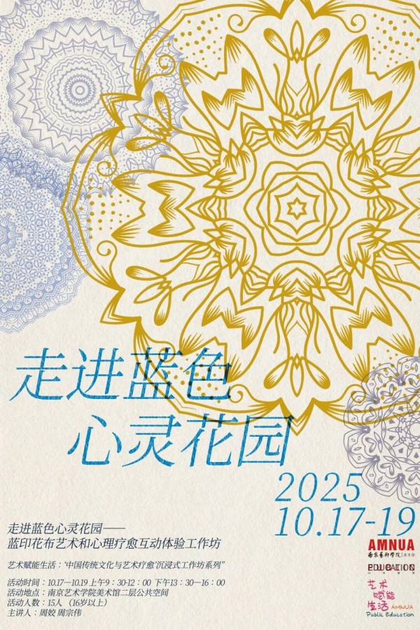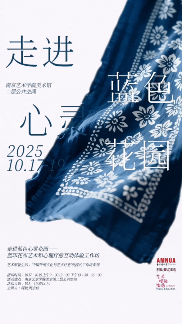 南京艺术学院美术馆公共教育部基于"传统文化疗愈,赋能现代生活"的学术理念,创新性地构建"走进蓝色心灵花园——蓝印花布艺术和心理疗愈互动体验工作坊“。该项目立足于跨学科研究视域,将国家级非物质文化遗产蓝印花布技艺与现代心理疗愈科学进行深度融合,探索传统文化的创造性转化与创新性发展路径。
