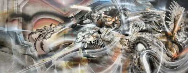 这幅作品可视为我2023年度的代表创作,也是该年我个人创作中尺寸最大的一件。作品名称与灵感来源于北欧神话中的“诸神黄昏”(Ragnarök)。此作在某种程度上可视为当年整个系列主题的集大成之作,系列中多件小幅作品的元素与意象分别延伸并映射于本幅画面之中,彼此交织如线索般相互呼应。诸神黄昏象征着维京北欧神话中时代的终局,其以毁灭式的悲剧收场,却也预示着新一轮的重生。本作品借助“诸神黄昏”这一神话定局,试图对“结局”本身进行重构与诘问。画面通过神祇与兽形的交错排列,构建出一种充满张力的冲突性力量,而此种冲突又借助光影的叠映,形成一种看似“暧昧”的和谐氛围。藉由这种视觉表达,作品传递出对既定命运结果的质疑与抉择意识,同时也映照了虚拟游戏中将最终选择权交予“玩家”的叙事策略。